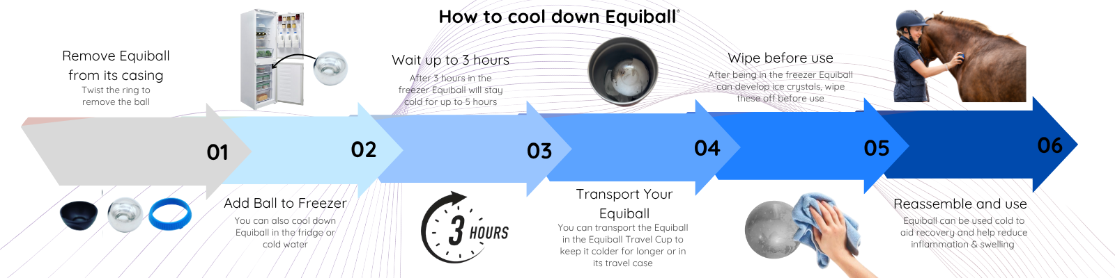 The Equiball (removed from the casing) can be placed into the fridge or freezer depending on level of cryotherapy required. We recommend for 2+ hours.